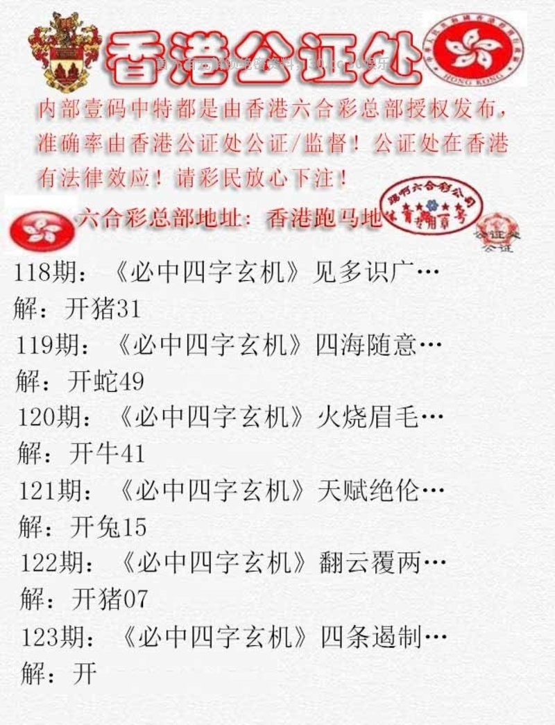 港彩公证处四字玄机第122期
